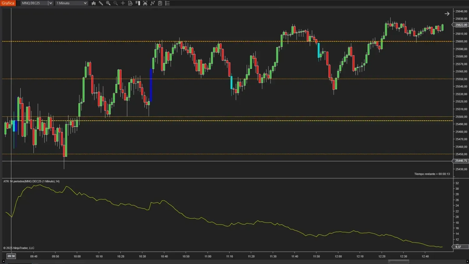 Hablemos de realidad. El NASDAQ 100 es el Ferrari de los mercados. Es volátil. Si miramos un indicador de volatilidad como el ATR (Average True Range) en un gráfico de 1 minuto en una sesión normal, veremos que el precio se mueve de media entre 30 y 40 puntos por minuto.