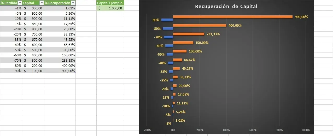 Como ves en la tabla, para recuperar un -20%, necesitas hacer un +25%. Si caes a un -50% (muy fácil con cuentas pequeñas y estrés psicológico), necesitas hacer un +100% solo para volver a cero (Breakeven).