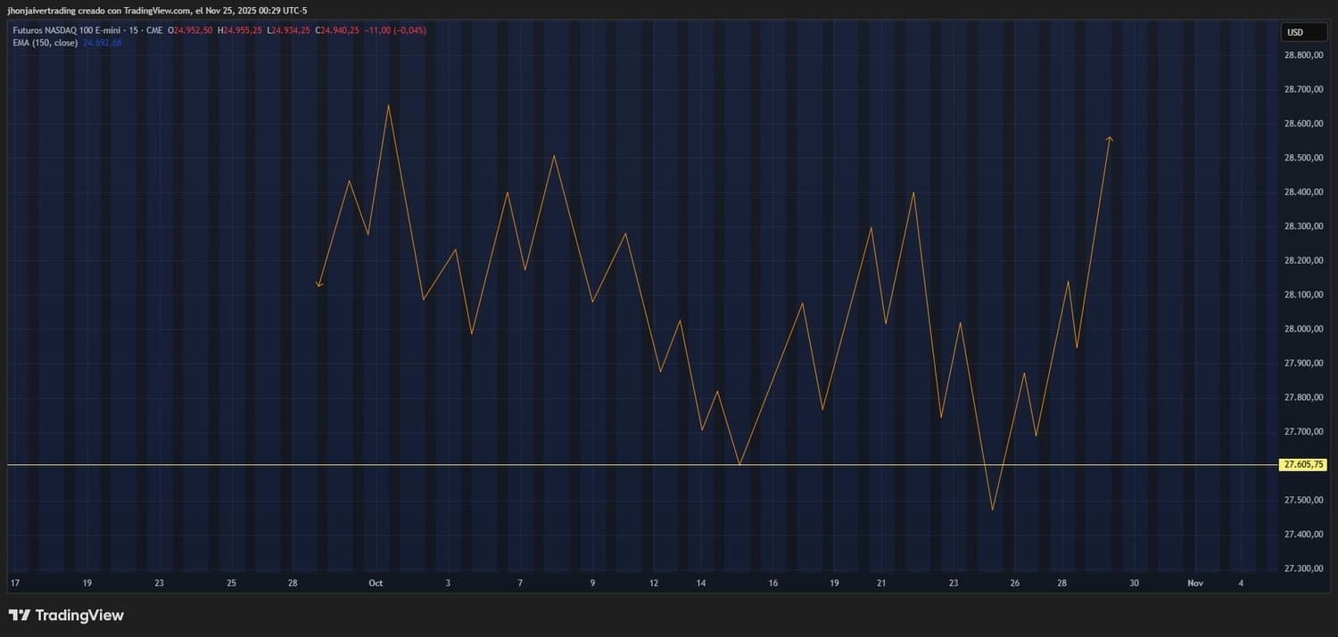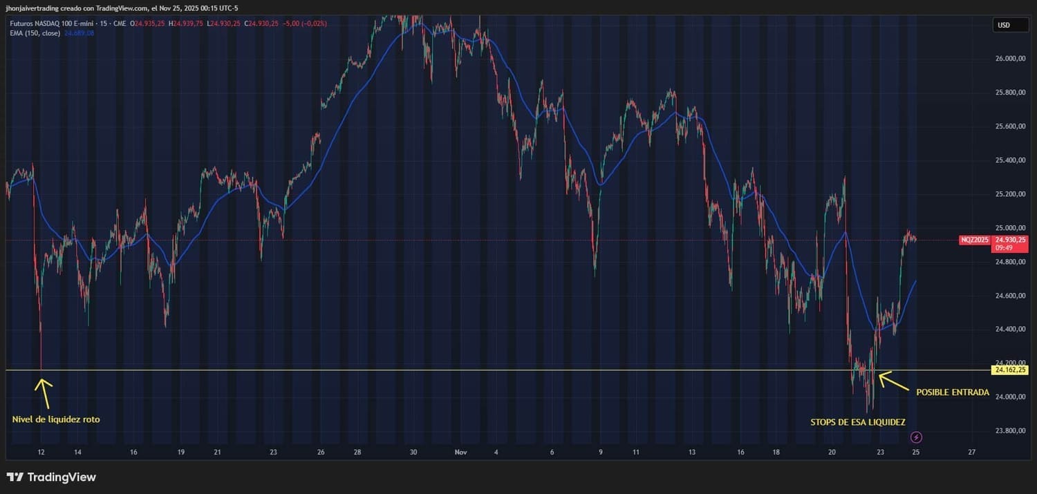 Mira este gráfico reciente del NASDAQ en temporalidad de 15 minutos: