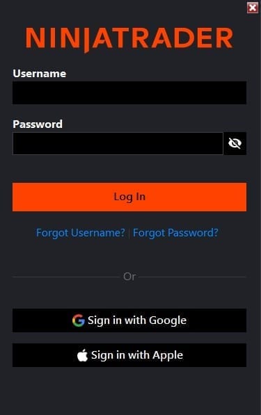 Una vez hayamos instalado la plataforma, al acceder al programa la primera ventana que nos ofrece será la siguiente, la cual para continuar pondremos nuestros datos de acceso a ninjatrader tal cual los pusimos en la pagina web a la hora de acceder a nuestro "dashboard":