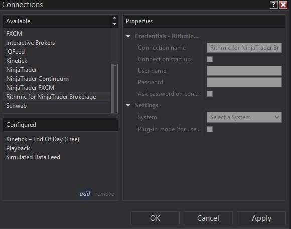 Ya en este momento, seleccionamos Rithmic for Ninjatrader" y le daremos en la parte inferior de esta ventana donde nos indica "add" y agregaremos esta conexión.