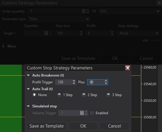 "Stop Strategy" (Opcional pero recomendado): Puedes configurar un "Auto Breakeven" para que el stop se mueva a precio de entrada automáticamente cuando el precio avance X "ticks" a tu favor. en este caso, por ejemplo yo suelo recomendar para iniciar, "Proffit Trigger de 120 "ticks" y "Plus" 60 "ticks".