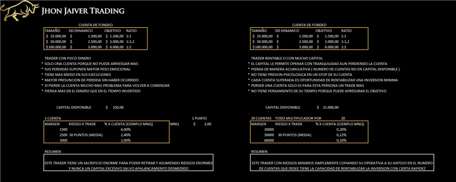 Tu matemática (La clave del éxito): Para ganar lo mismo que el trader de la izquierda, tú solo necesitas arriesgar un 0.10% o 0.20% por cuenta.
