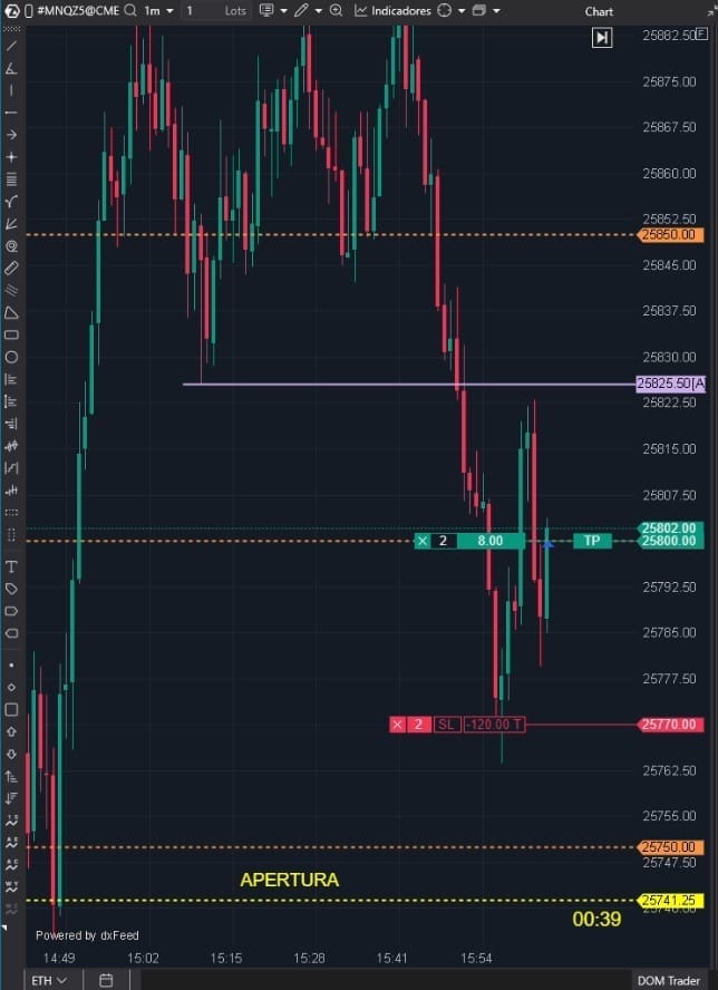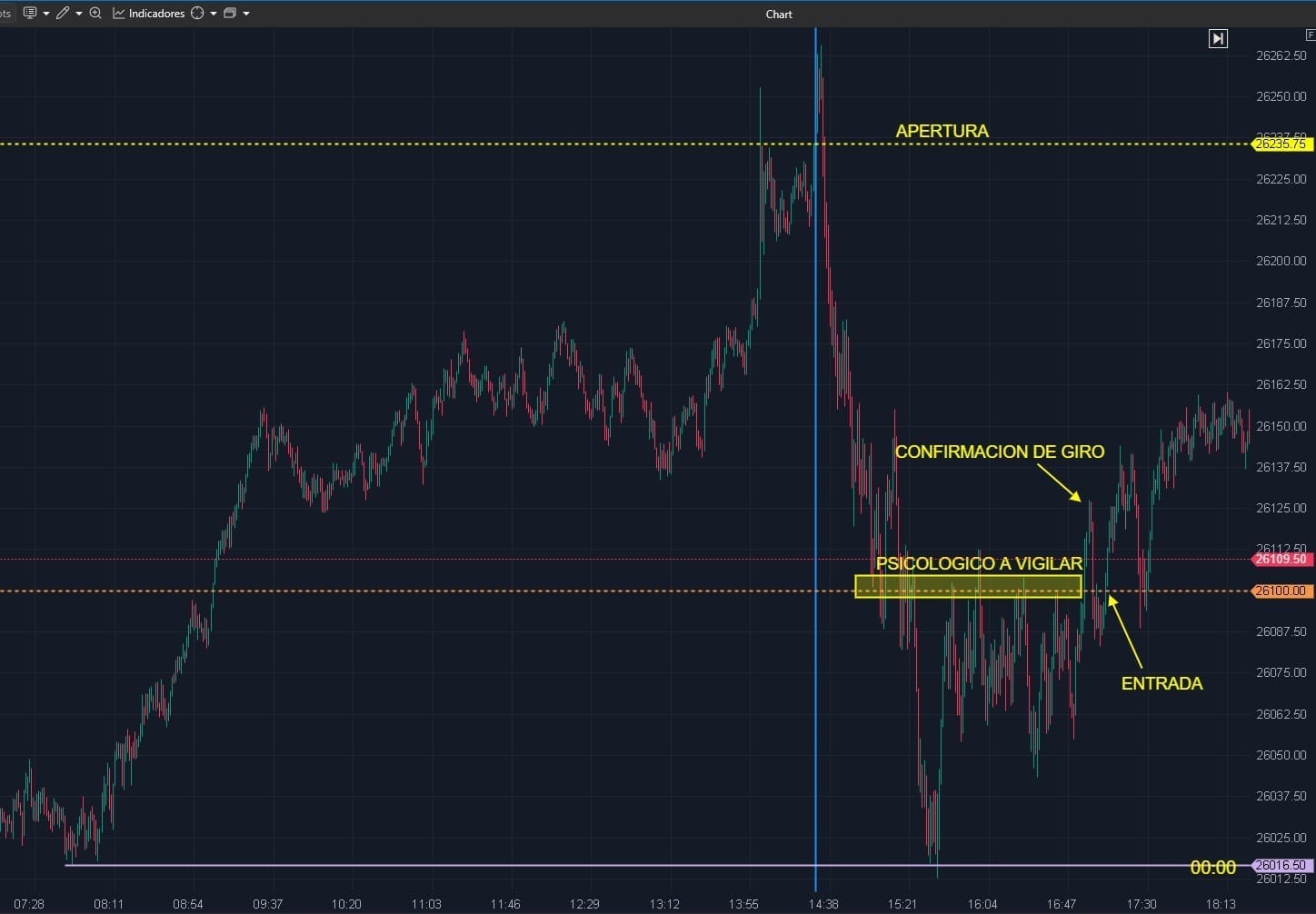 Espero a que el precio confirme su dirección con un cierre de vela de 1 minuto por encima (para compras) o por debajo (para ventas) de un nivel psicológico (ej. 25.500, 24.550).