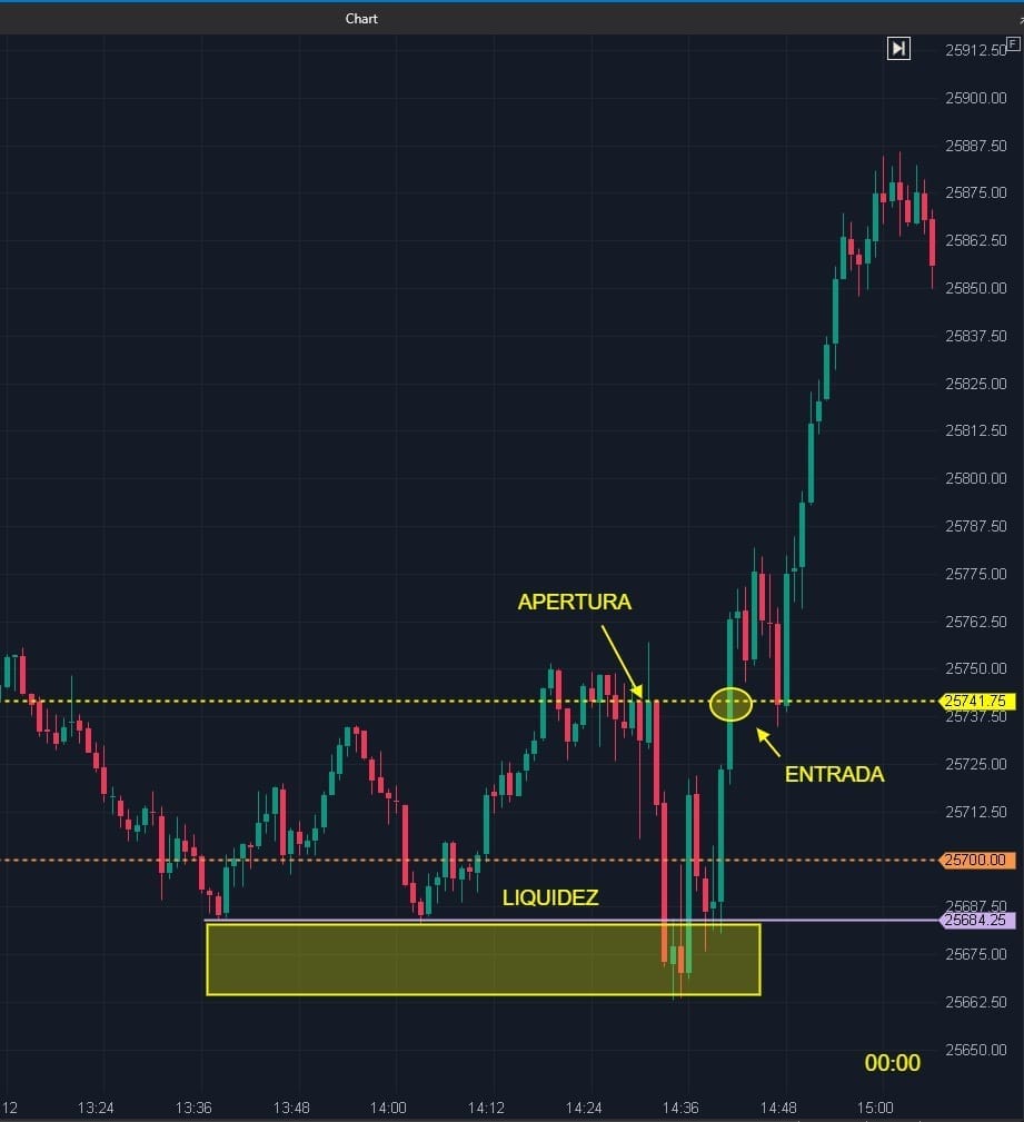Cuando el precio, después de esa limpieza, regresa con intención hacia el precio de apertura del día, ejecuto mi entrada a favor de ese nuevo movimiento. Estoy operando con el impulso que dejaron los "traders" atrapados.