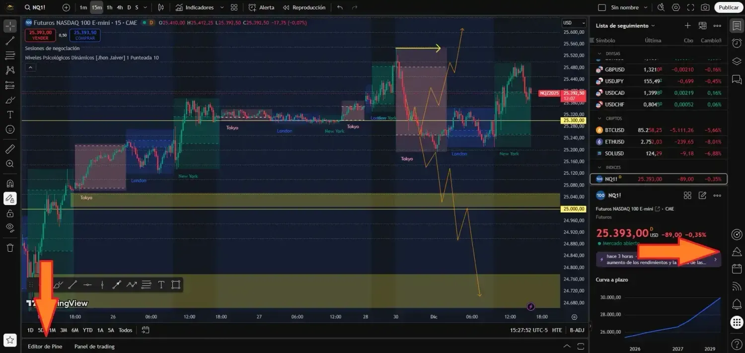 1. Abre el Editor: En la parte inferior de tu gráfico de TradingView, haz clic en la pestaña "Editor de Pine", o en la barra lateral derecha similar a un triángulo.