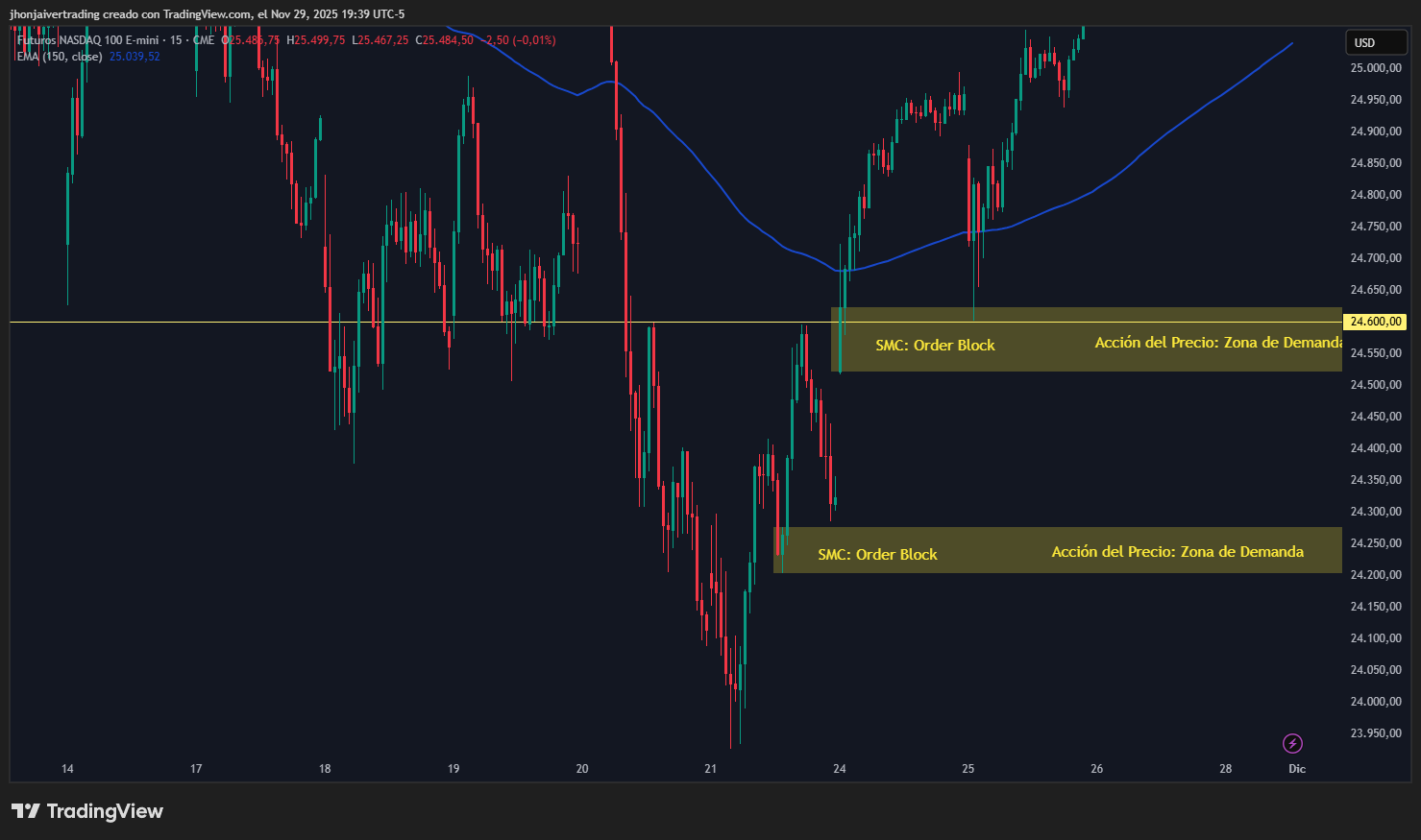 1. A la izquierda: Uno mío en el NASDAQ, donde solo esperamos movimiento de rotura de liquidez por debajo y compramos cuando vemos la oportunidad.